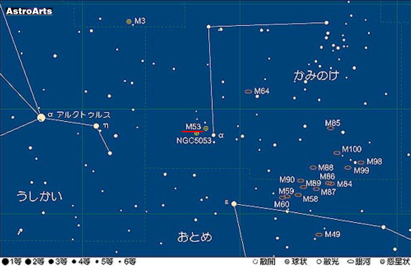 これらの銀河の中にポツンと置かれたような球状星団がM53です。